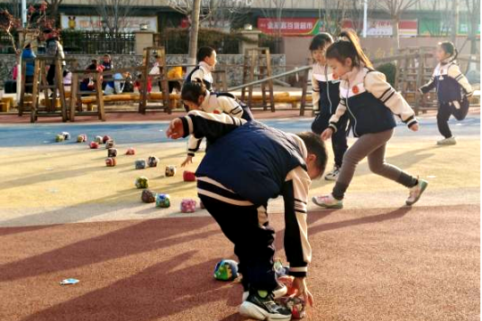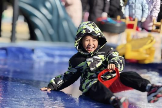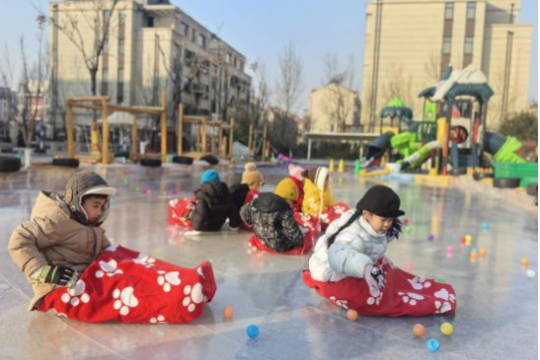 为发挥冰雪育人的独特功能,我园利用严寒天气,开展了一场别开生面的冬日趣味滑冰体验活动。在园领导带领下,教师巧用塑料布、沙袋等材料,结合滑梯等设施自制滑冰场,并围绕场地安全、活动组织、创意玩法、安全照护开展教研,保障活动顺利开展。
