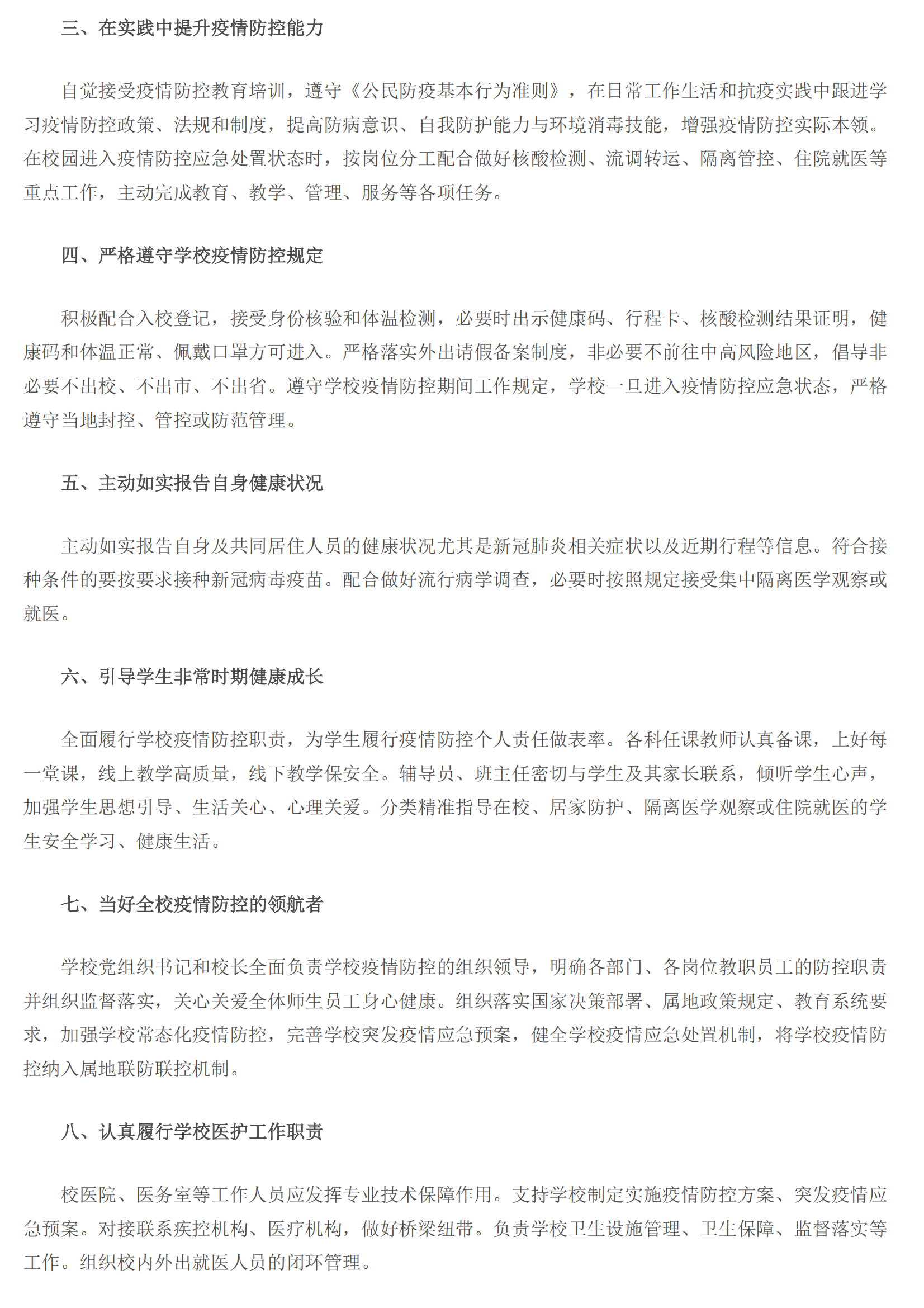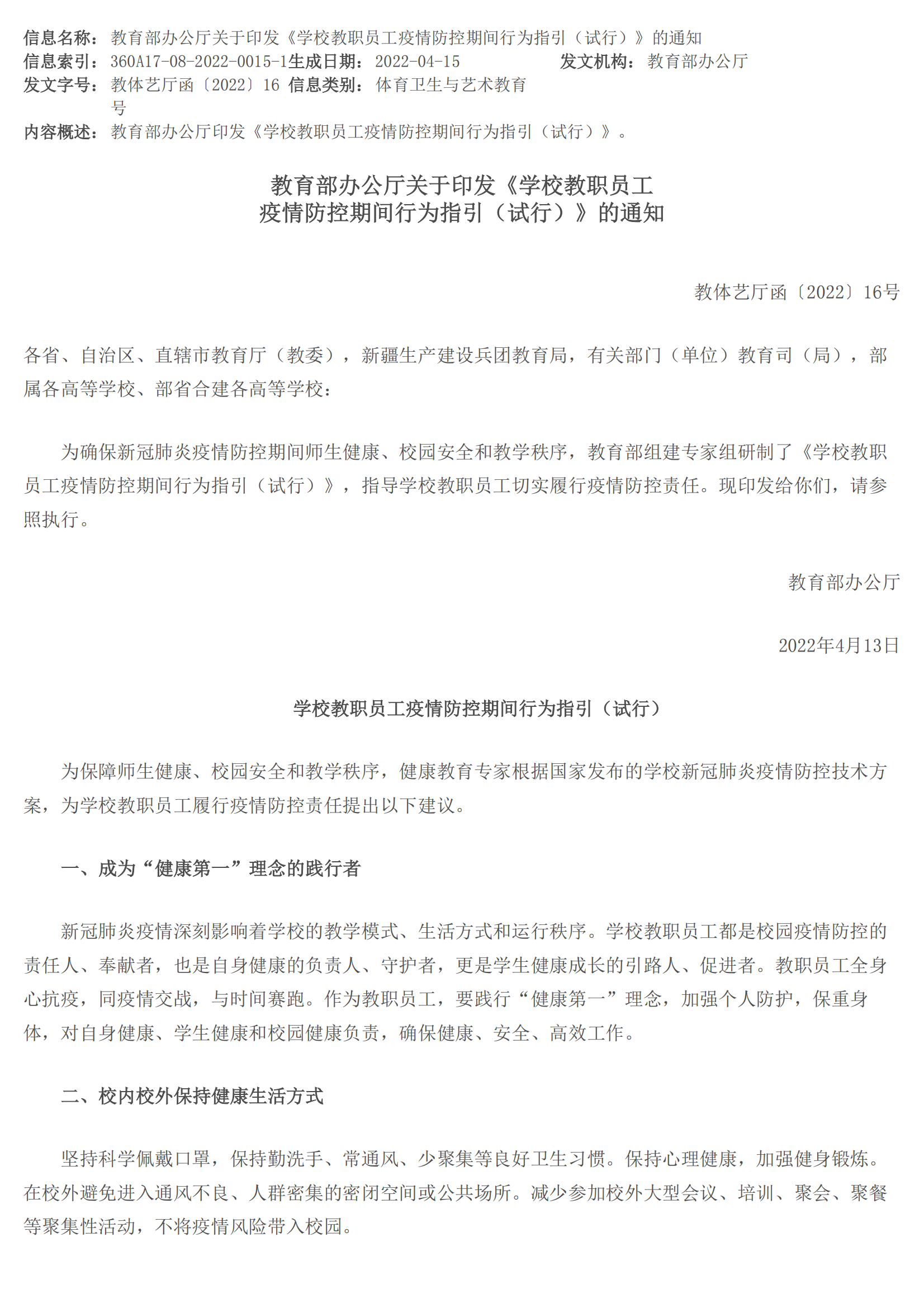 教育部办公厅关于印发《学校教职员工疫情防控期间行为指引(试行)》的通知