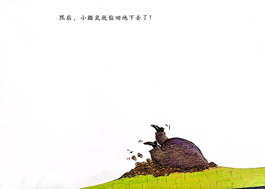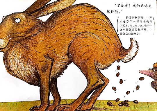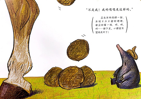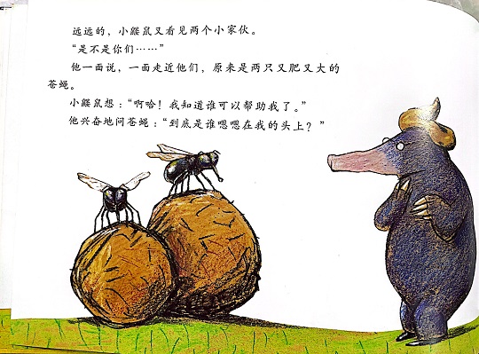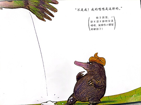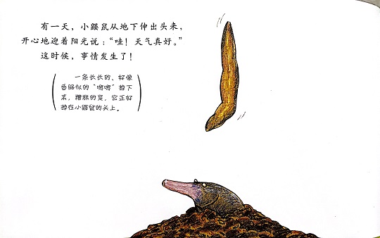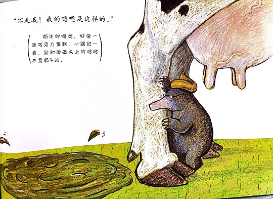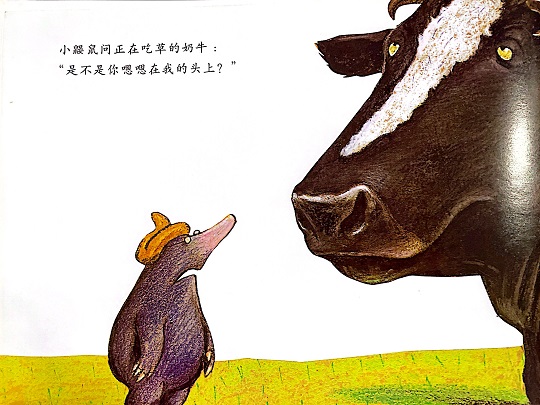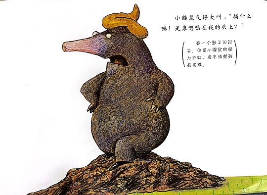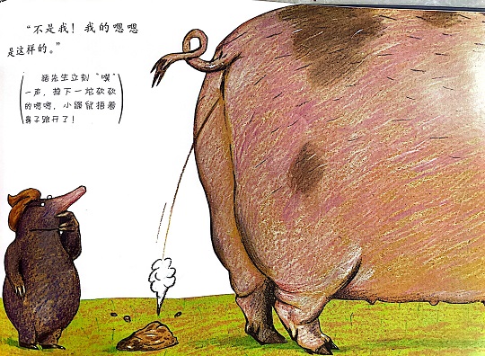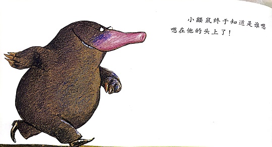 本书是一本有“味道”的绘本,讲述的是一只小鼹鼠从地下伸出头来晒太阳的时候,一坨“嗯嗯”掉在它的头上,它火冒三丈却不知道是谁惹的祸,于是小鼹鼠大胆地去求证寻找祸主的故事。