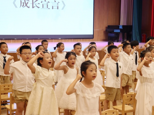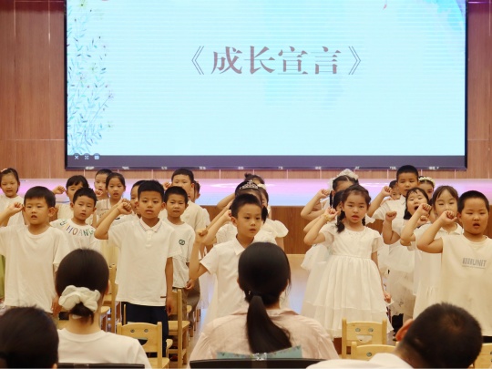 全体大班幼儿面向父母,昂首挺胸,目光坚定,高举右手,用坚定的声音齐声宣读《成长宣言》,以昂扬的姿态迎接即将开启的小学新篇章。
