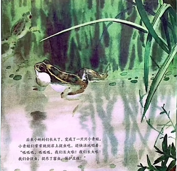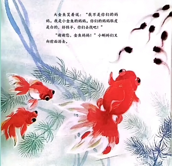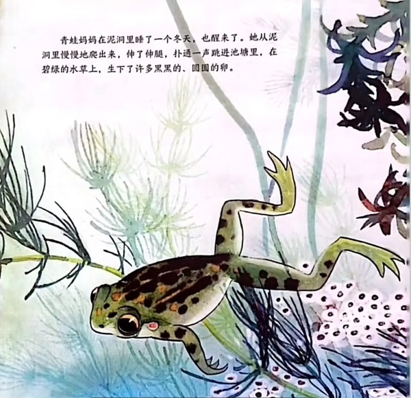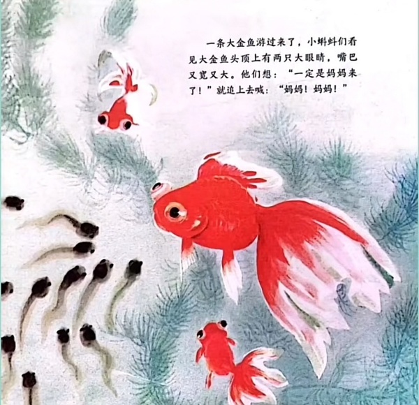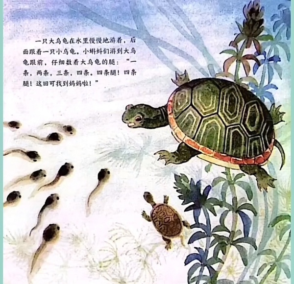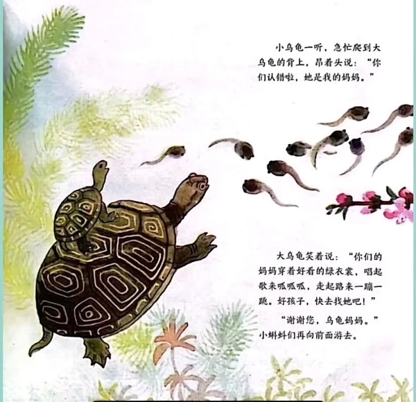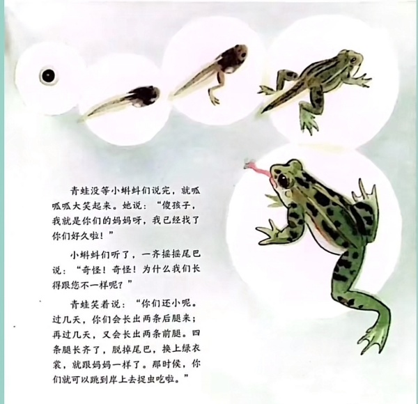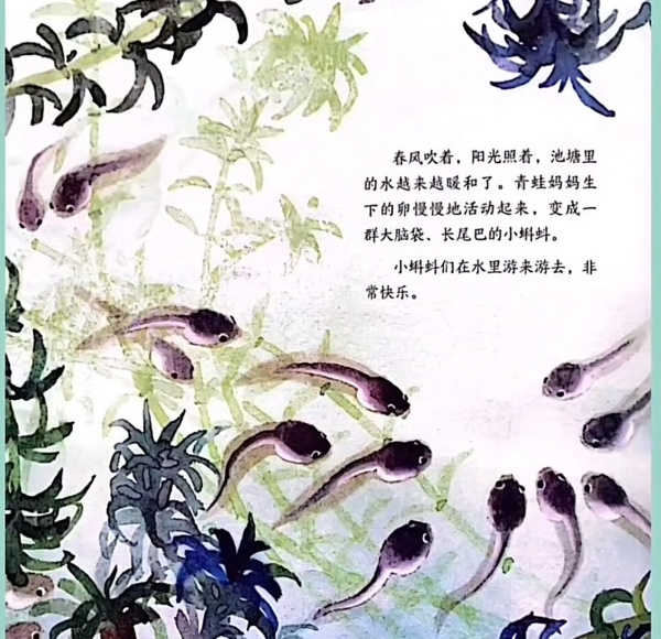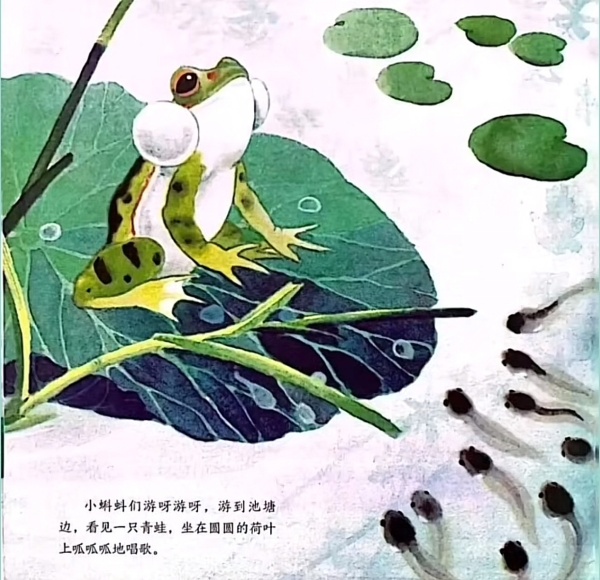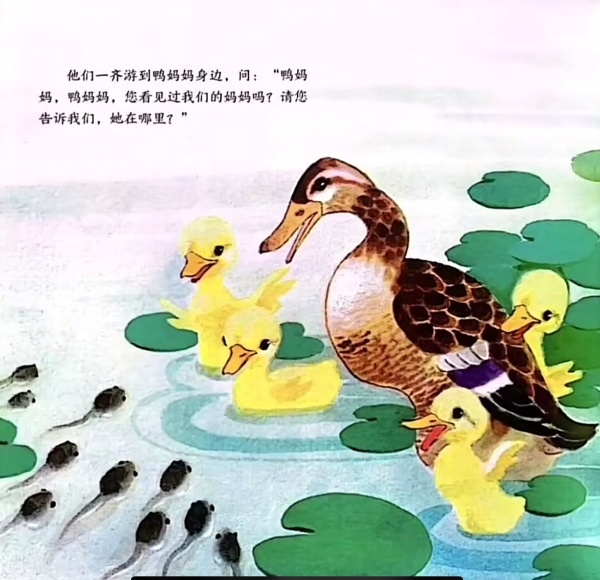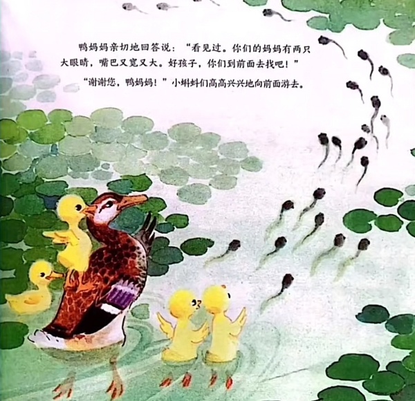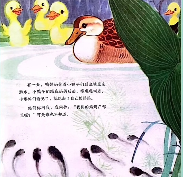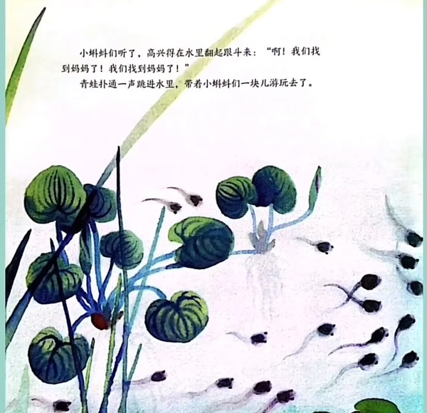 一群刚孵化的小蝌蚪,在水里快活地游着,却不知道妈妈是谁。它们先遇到鸭子,又碰到金鱼和乌龟。一路询问,经历波折,最后在荷花池找到青蛙,终于明白:原来自己长大后,会长出四条腿,尾巴也会消失,变得和妈妈一样。