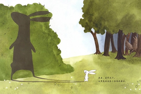 在一个晴朗的早晨,小白兔外出时发现一只神秘的大黑兔紧随其后,它被吓得尖叫逃跑。它躲在树后、跳河游泳、闯入黑暗森林,甚至遭遇大灰狼追赶。最终在阳光下,小白兔发现大黑兔竟然是自己的影子。当大灰狼再次来袭时,影子“挺身而出”,吓跑了坏人。
